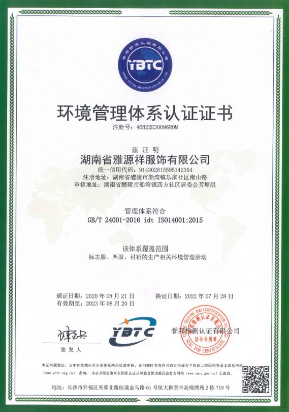 環(huán)境管理體系認證證書